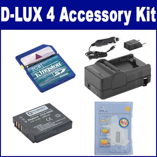 Leica D-LUX 4 Digital Camera Accessory Kit includes the following items: 1) CGA-S005 Lithium-Ion Battery - Rechargeable Ultra High Capacity (1300 mAh) - replacement for Panasonic CGA-S005 & Leica 18640 BP-DC4 Batteries 2) Mini Battery Charger Kit for the Panasonic CGA-S005, Leica 18640 BP-DC4 Batteries - with fold-in wall plug, car & EU adapters 3) 2GB Standard Secure Digital (SD) Memory Card 4) Digital Camera/Camcorder Deluxe Cleaning Kit with LCD Screen Guard